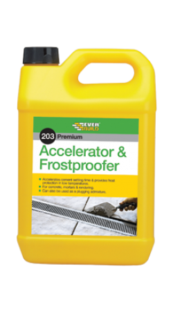 Everbuild 203 Accelerator and Frostproofer - 5 litre. Accelerator & Frostproofer is a liquid additive formulated to accelerate setting and hardening times of mortar concretes screeds and rendering to provide frost protection during the setting period. Effective even in sub-zero temperatures and can also be used in normal temperatures where a rapid set is required and as a plugging admixture.